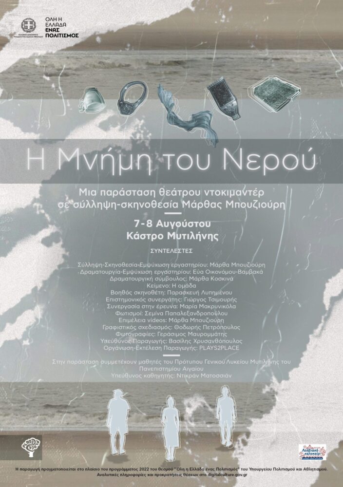 Με άξονα την προφορική ιστορία και την αξιοποίηση βιωματικού-βιογραφικού υλικού, η δράση Η μνήμη του νερού θέτει στο επίκεντρο την αξία της μνήμης και τη σημασία της διατήρησής της για την ιστορική και πολιτισμική συνοχή και συνέχεια, αναδεικνύοντας ίχνη της προσφυγικής ταυτότητας του νησιού της Λέσβου μέσα από το βλέμμα της νέας γενιάς.