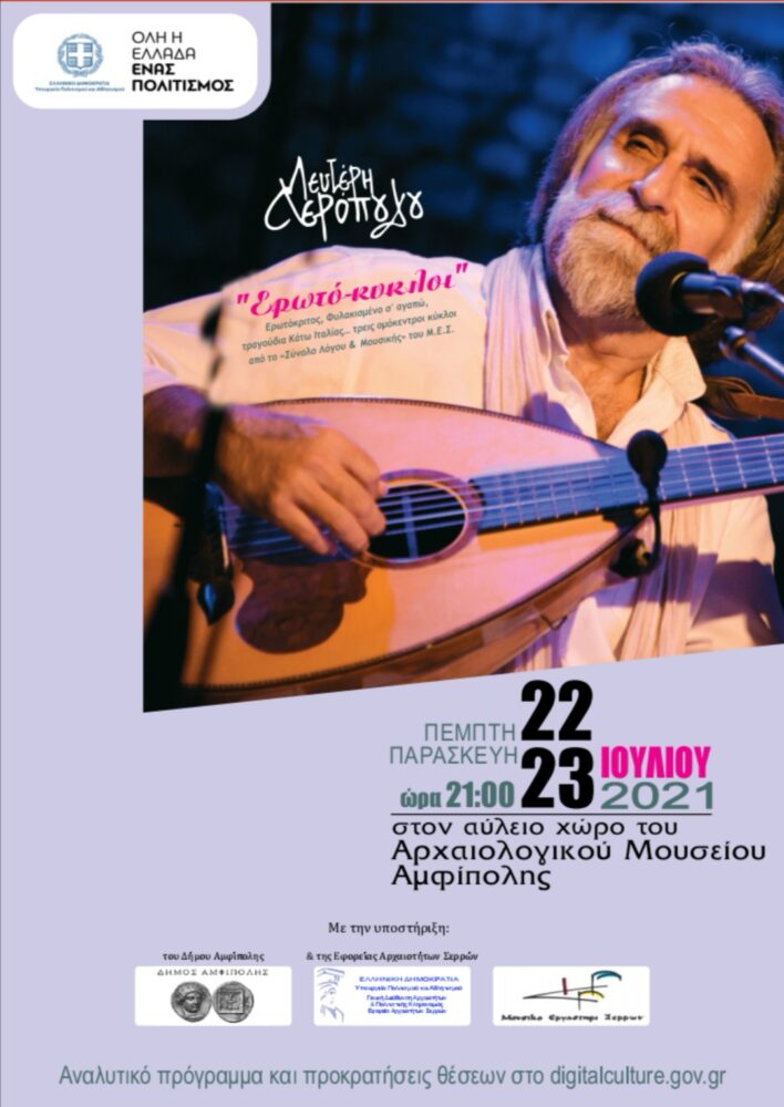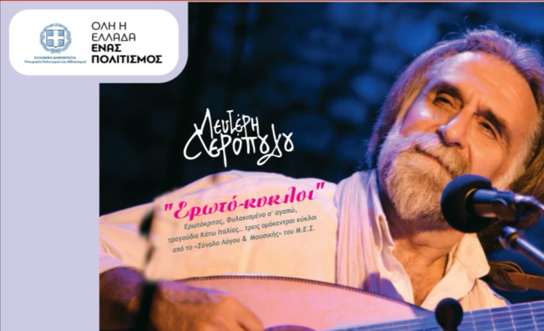 Το έργο του Λευτέρη Αερόπουλου «Ερωτό-κυκλοι» είναι ένα μουσικοθεατρικό ταξίδι που ξεκινά από τον «Ερωτόκριτο» του Βιτσέντζου Κορνάρου, συναντά τραγούδια της Κάτω Ιταλίας, παραδοσιακές μεσογειακές μουσικές δραματοποιημένες, και φτάνει στο «Φυλακισμένο σ’ αγαπώ» του Λευτέρη Αερόπουλου. Τρεις ομόκεντροι κύκλοι μουσικής, λόγου και κίνησης. Μια μουσικοθεατρική παράσταση για μικρούς και μεγάλους με χορικά, ποίηση θεάτρου, σκηνική δράση. Ένα κράμα Ανατολής και Δύσης, με συνείδηση καταγωγής και ελεύθερη βούληση.