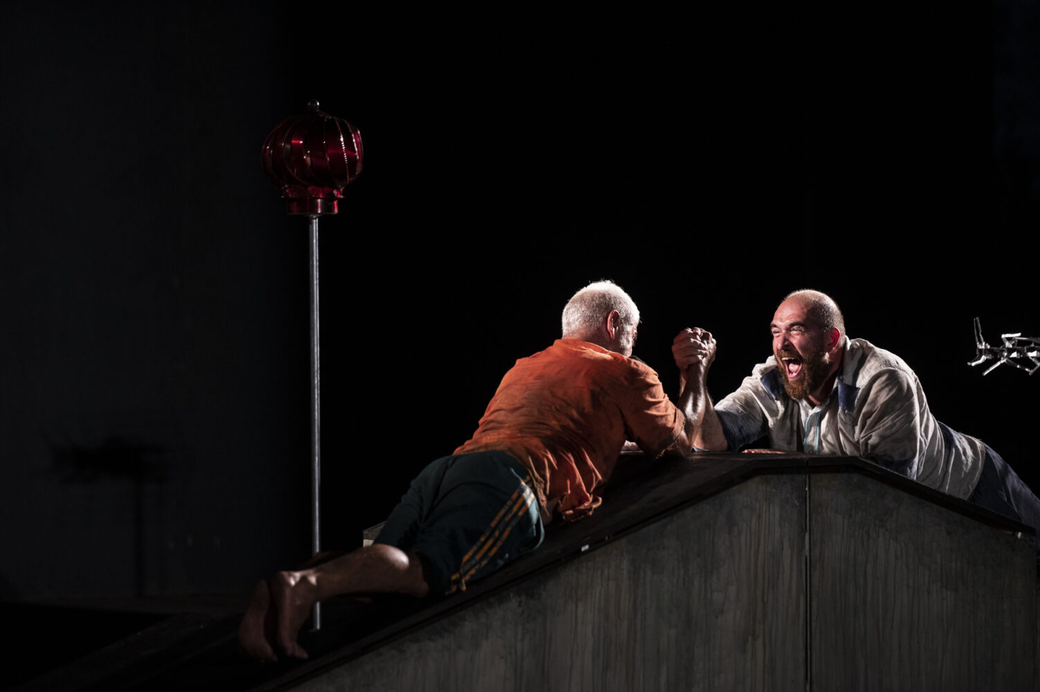 Ενώ τα πάντα γύρω τους έχουν απαλειφθεί από πρωτοφανή πλημμύρα, δύο άντρες βρίσκουν καταφύγιο πάνω σε μια σκεπή σπιτιού. Ως «ναυαγοί» είναι υποχρεωμένοι να ζήσουν μαζί για ένα διάστημα, όμως η ύπαρξη του «άλλου» φαντάζει εχθρική. Καθώς δεν μιλούν την ίδια γλώσσα προσπαθούν να επικοινωνήσουν με νοήματα και με τη γλώσσα του σώματος, κι αυτό γεννά έντονες κι εκρηκτικές καταστάσεις, συχνά ξεκαρδιστικές. Μόνοι στον κόσμο οι δυο «εχθροί», μην έχοντας αλλού να στραφούν, θα πλησιάσουν σιγά σιγά ο ένας τον άλλον και θα βρουν τρόπο να συνυπάρξουν. Και τότε έρχεται η ανατροπή… Και μετά τι; Ένα έργο με χιούμορ, για μικρούς και μεγάλους, ιδιαίτερο και συγκινητικό.